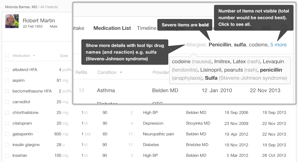 In our "after" example (Figure 4.2), by not listing the symptoms we were able to show more substances. The "5 more" indicator is more obvious and helpful than the hover-function it replaces, clearly telling users that the patient has five more drug allergies which are not displayed in this concise view. The number without the word “more” could be confusing. At first glance, our minds will try to jump to a conclusion about what the number means (Is it a “total of 5,” or are there “5 more” to be seen?).