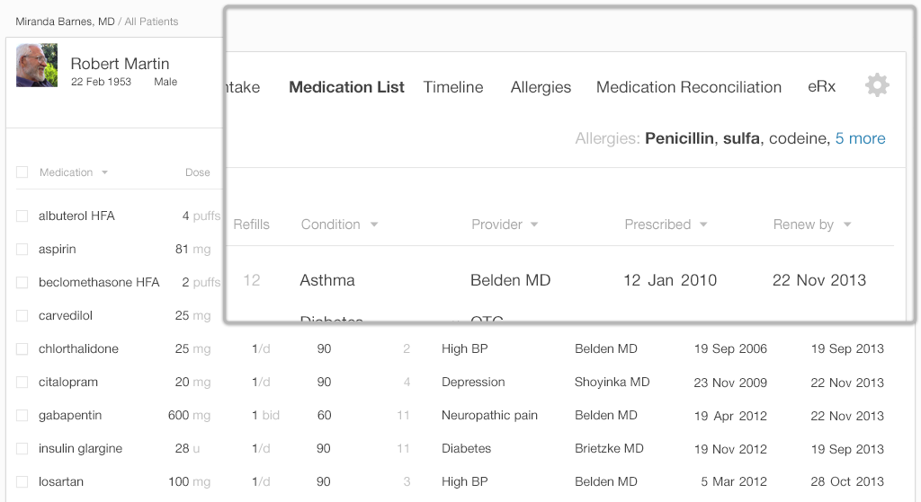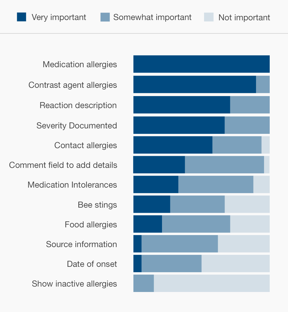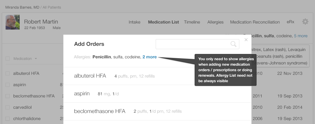 For this task, physicians need to be able to glance at a short list that only contains the names of the drugs a patient is allergic to. This list could be clearly visible when physicians are prescribing or administering, but they don't need to see it when performing unrelated tasks, such as documenting the visit in a note. The list could be included in the patient demographic banner, where it would always be visible even while physicians do tasks that don't require it.