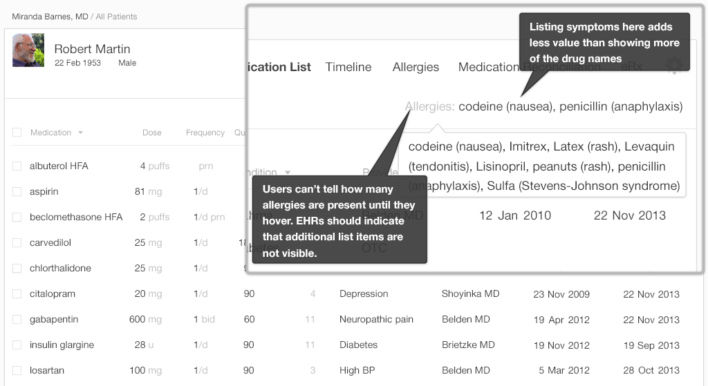 This example (Figure 4.1) uses some of its limited space to list symptoms. The total number of items in this potentially long list is not visible unless the user hovers over the list with a mouse. The user may, however, be using a touch interface, and touch interfaces don't allow users to hover. Thus information stored in this format isn't easily accessible to some users; making use of a click or tap instead of hover will help. Listing additional substances here would actually help physicians out more. Physicians need to know, at a glance, if they're seeing all the substances on the Allergy List, or if what they're looking at has been truncated.