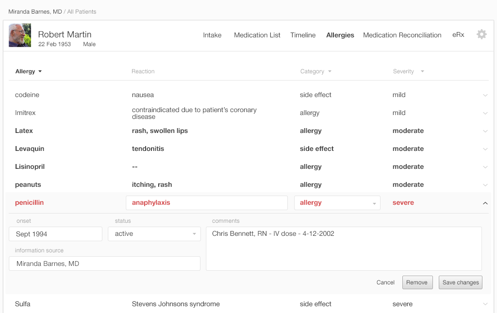 In one way, the Allergy List is the safety net that supports the Medication List. Physicians check the medication list against this list of allergies in order to ensure patient safety. Allergic reactions can range from minor to fatal, so the Allergy List needs to be kept current to prevent these events. Good design can simplify correcting errors in the Allergy List.