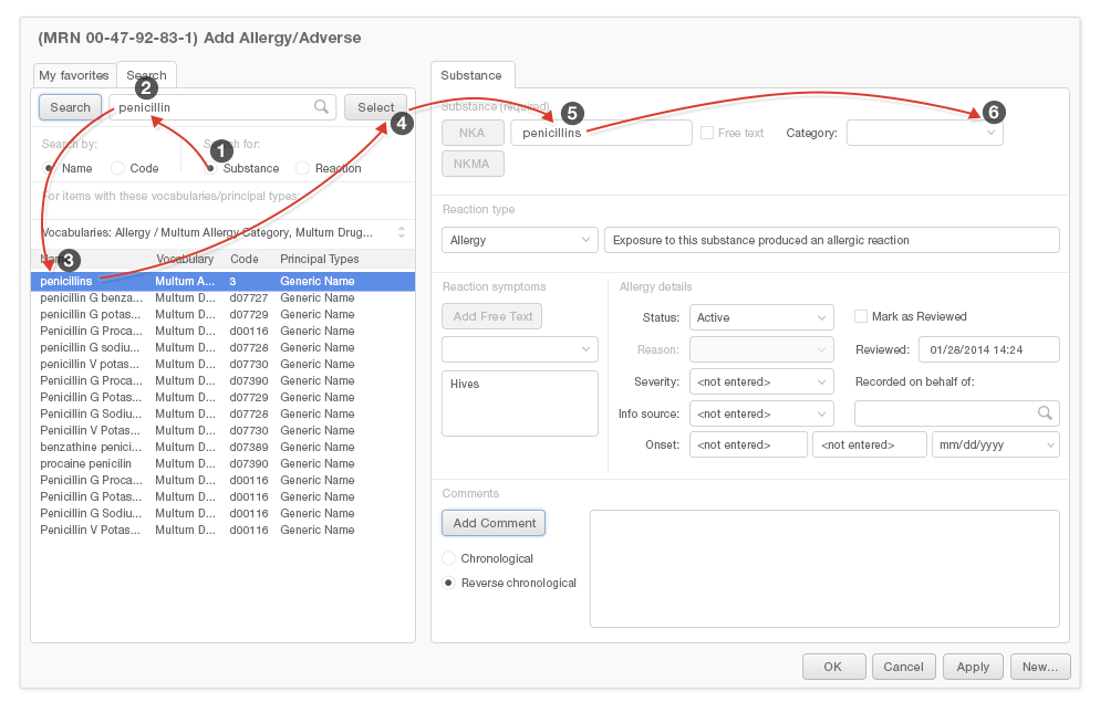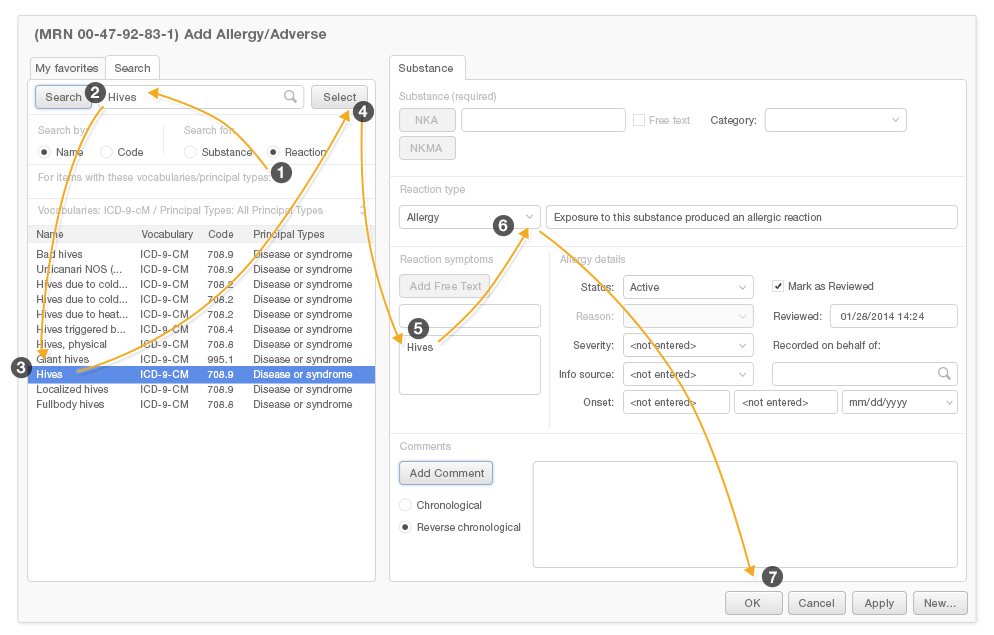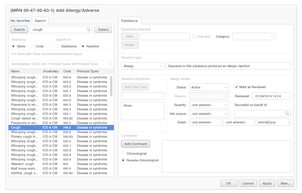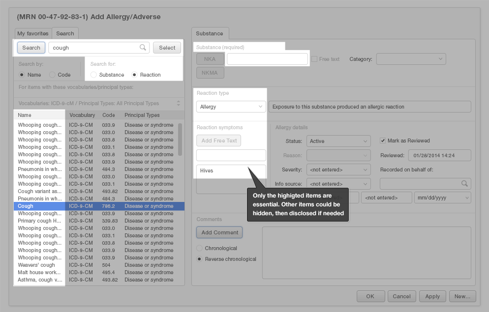 Predictive search fields can substantially reduce the mental effort and time it takes physicians to add entries to an Allergy List. Pushing the most likely results to the top of the list of predictive search results will make it easier for users to find what they're looking for. Users are far more likely to want to enter a simple description, like "cough," than they are to want to enter a more detailed result, such as "whooping cough" or "smoker's cough."