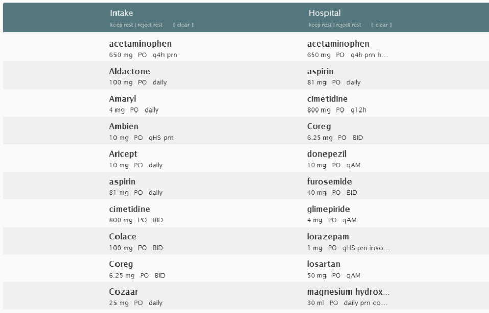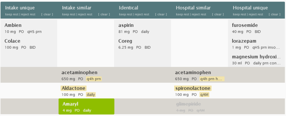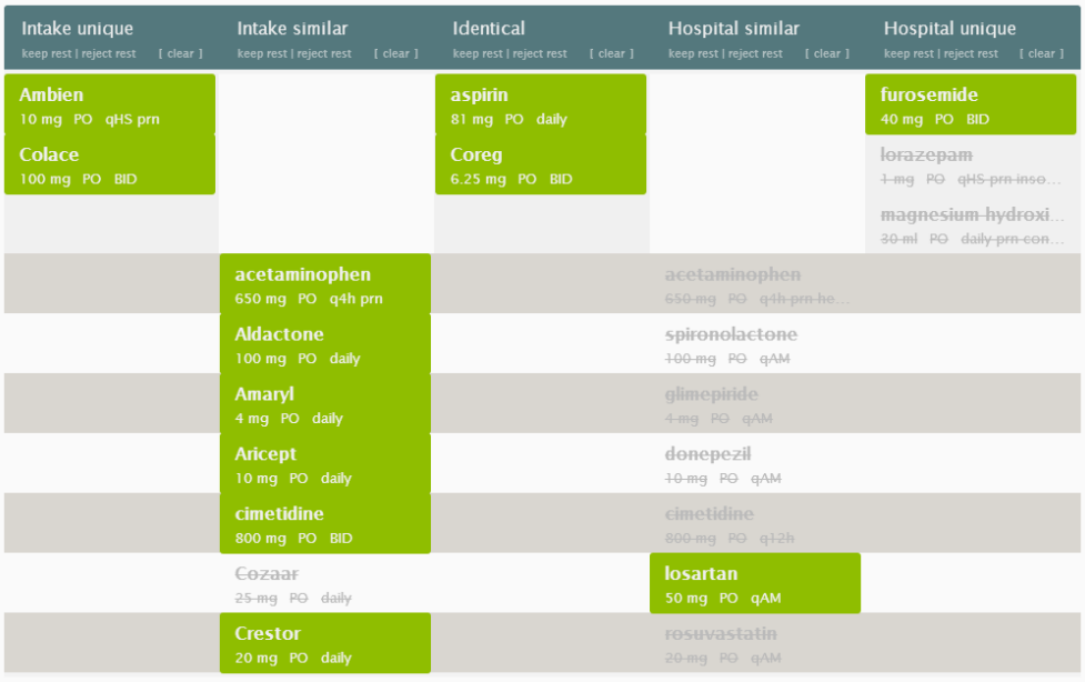 Example: The medication reconciliation view below (Figure 7.10) breaks medications into groups. It then places these groups in the same columns. Users can tell there are different groups (columns) at a glance, without having to focus on, read, and understand all the information on the chart.