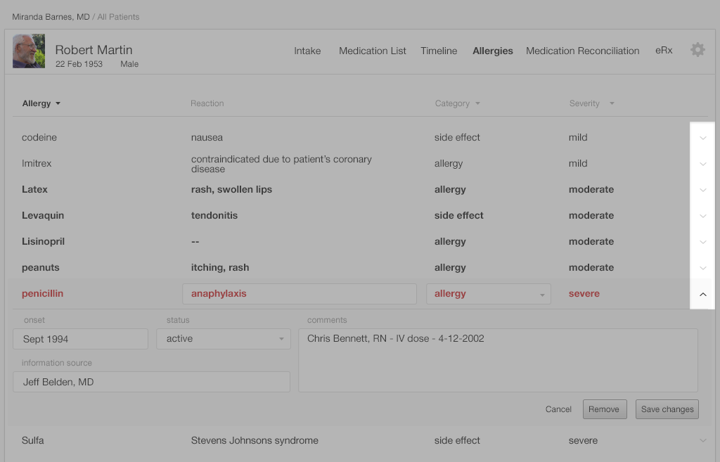 Example: The list in Figure 7.25 shows essential allergy information in four columns. The user has all the information she needs about the patient's medication allergies to make prescription decisions. If she needs additional information about the patient's allergies, she can select an entry to see more details.