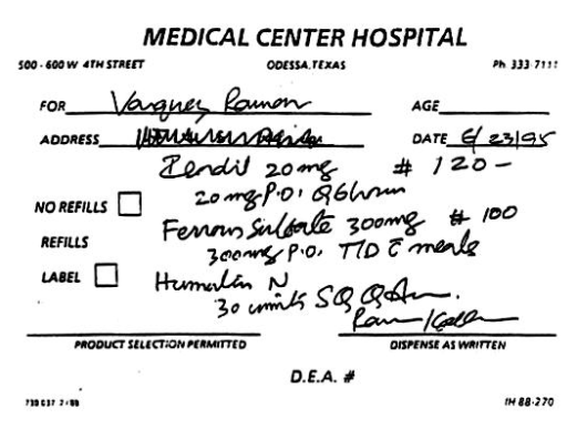 Most people read the following as “The cat,” even though the middle letter in each word is exactly the same, and neither is a perfect H or A. Our perceptual system uses context (the letters around the middle letter) and expectations (predicated on our familiarity with common English words) to allow us to cope with and make sense of imperfect, noisy input. But the same properties that make our perceptual system robust can also lead us astray. For instance, can you name the first drug on this prescription (Figure 7.2)?