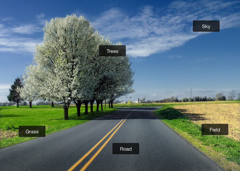 Example: When we look at Figure 7.19, below, our eyes first do a quick visual query. They seek out major landscape elements and the details that will help us accomplish whatever we're using this display to do. What we notice in the scene below will vary depending on whether we're driving, deciding if we need to mow the lawn, or assessing if the weather will be suitable for a picnic this afternoon.