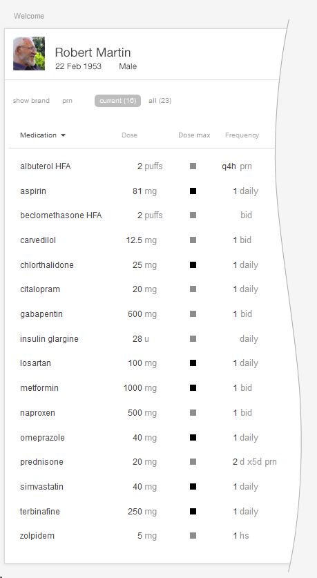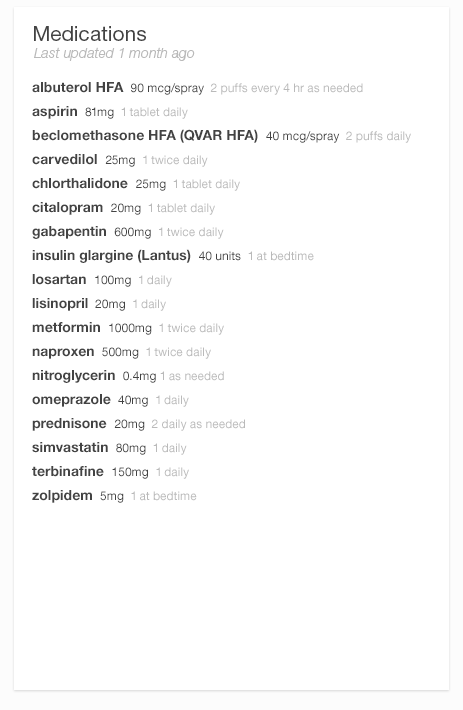 A physician or nurse would expect a progress note from a previous visit, a dashboard overview, or a visit summary from an outside EHR to make use of this simple format. It’s a quick snapshot, intended to be taken in at a glance. A physician doing a more complex task, like e-prescribing, might prefer an interactive display with more information, such as the interactive table or the medication timeline.