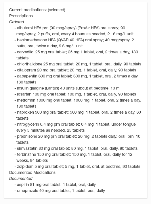 In this context, the physician just needs to quickly see the medications’ names. Avoid the temptation to add extraneous detail here. Concise lists are easier to read. Physicians don’t need to see the medications’ quantities, start dates, or the number of refills in a given prescription to perform this task. If the list uses a brand name, be sure to include the product’s generic name as well. Dealing with brand, generic, and compound names can be a challenge (see the following note).
