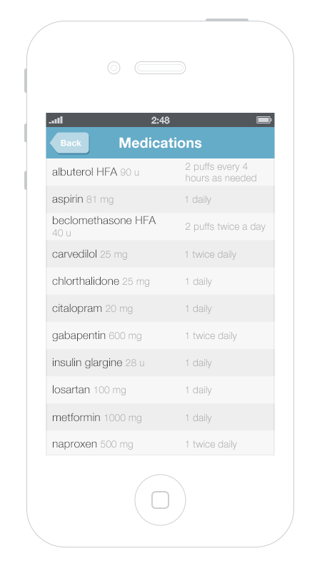 Patients can also use this list. Patients can easily show this list to other physicians, dentists, emergency room staff, or their caregivers. Patients filling up weekly medication reminder boxes might, however, need a more detailed list —perhaps one that illustrates the contents of each compartment of their box, and more clearly differentiates the time of day at which they should take each dose of medication.
