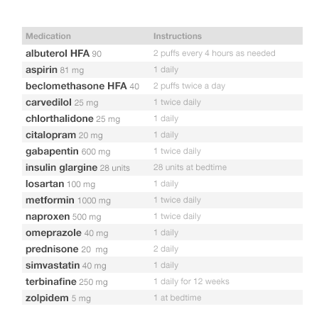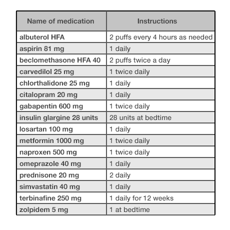 Look at Figure 2.1 and Figure 2.2. As you can probably tell, one list looks cleaner than the other. Such simplicity makes it easy for people using this list to see the names of the drugs the patient is taking, which allows a quick overview. Given that it uses plain language like “twice daily,” instead of Latin abbreviations like “b.i.d.,” the list below would meet the needs of both physicians and patients.