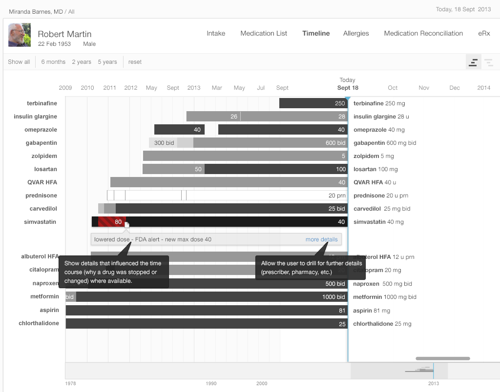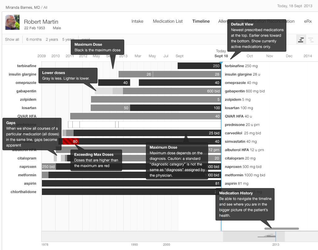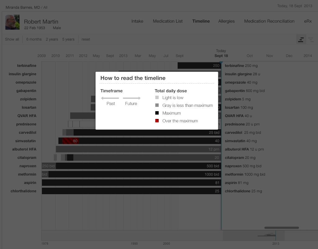 A medication timeline harnesses the power of information visualization to: