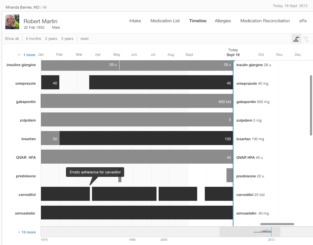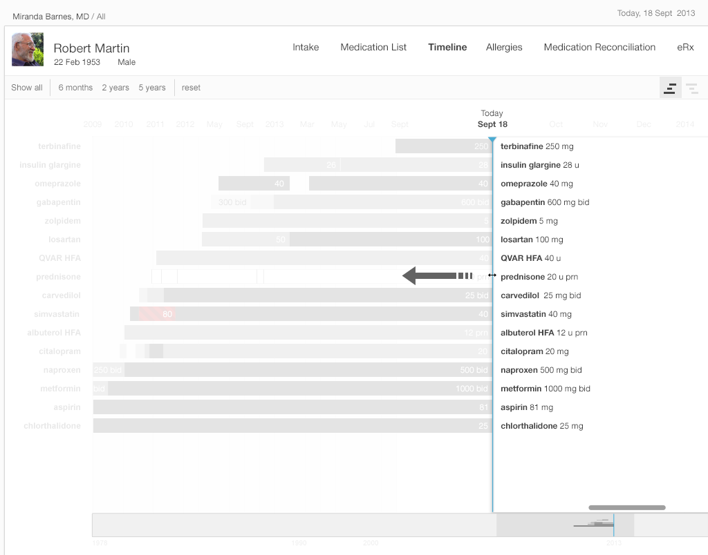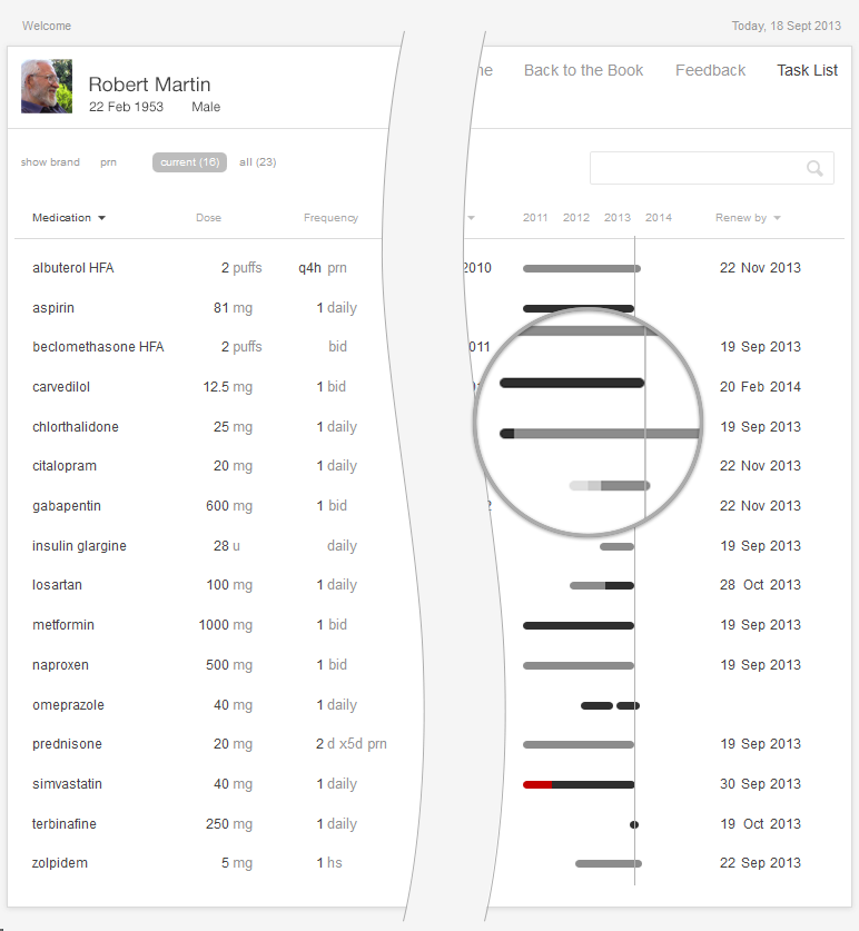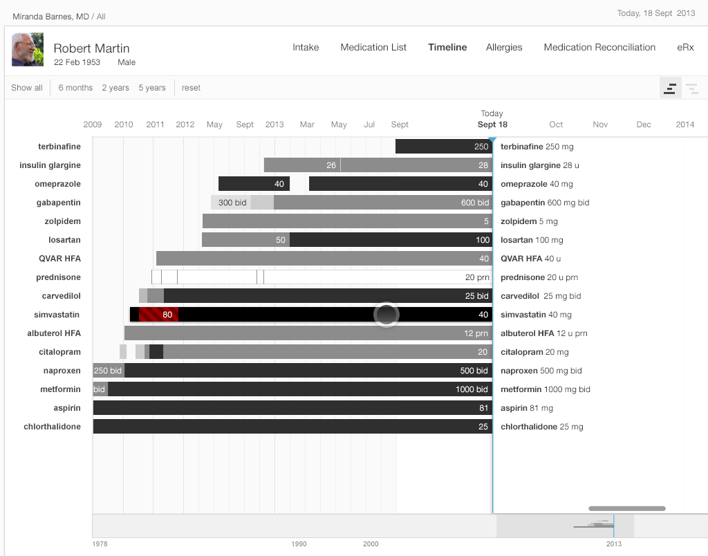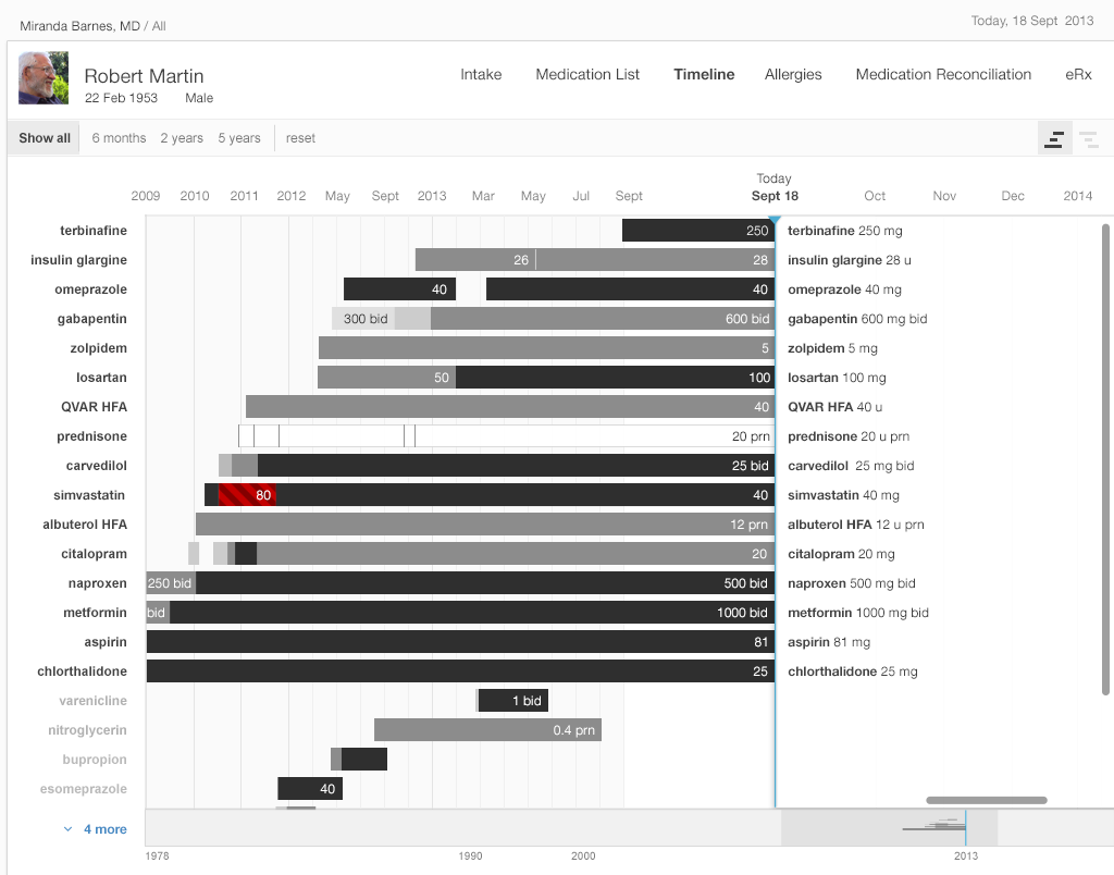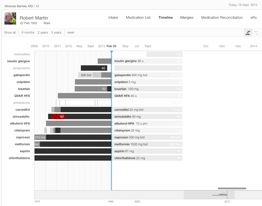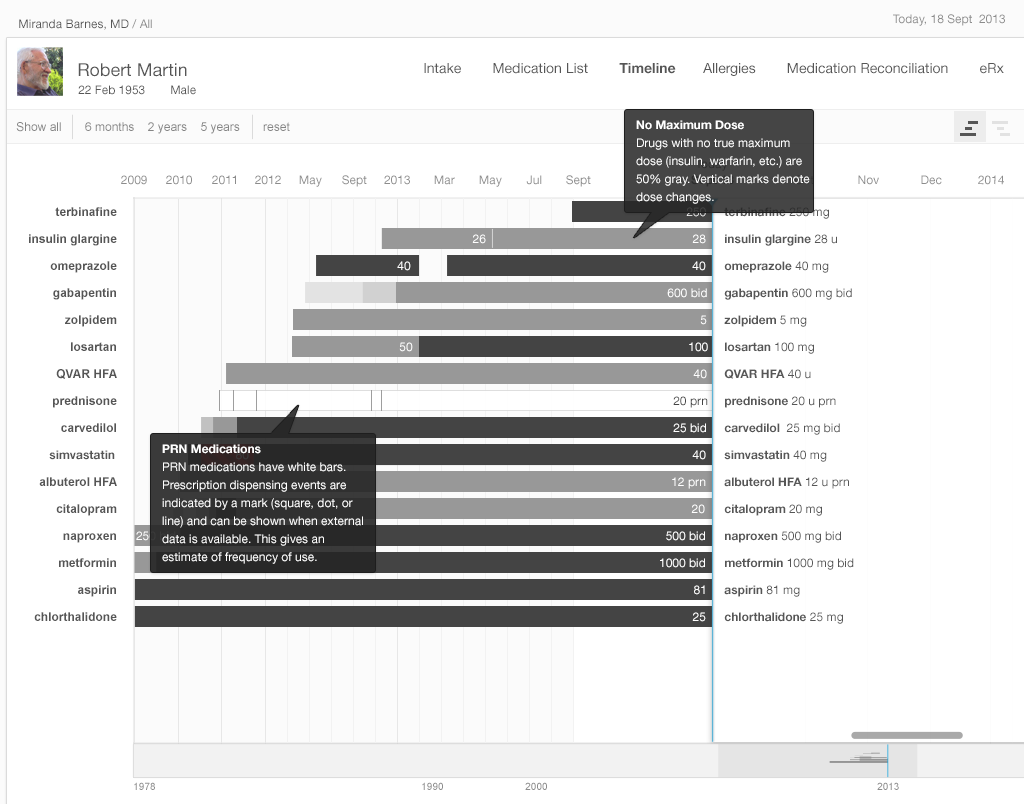 Our medication timeline aims to accommodate every conceivable user: physicians, nurses, patients, caregivers, pharmacists, mental health professionals, health coaches, and all other medical specialists. It can accommodate long lists of medications. A dozen medications can be quite common. Twenty medications would not be surprising. Thirty medications, sadly, may not be rare. The medication timeline handles the visual burden with ease. It’s a tool for data visualization, whose mantra is “overview first, then zoom and filter, then details-on-demand.” Let’s look at Gallery 2.5 to demonstrate how.