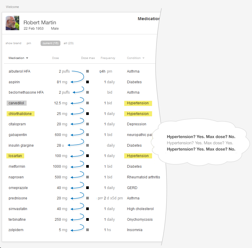 Dr. Barnes turns to the interactive medication list and sorts the medications by diagnosis. She can readily see that the patient is already on three medications for blood pressure. With some effort, she determines that all three medications are at their maximum dose. The patient will have to begin taking an additional blood pressure medication. She thinks prescribing lisinopril is the obvious next step, but given that this decision does seem so obvious, our physician wonders if there’s some hidden reason why the patient isn’t on lisinopril already.