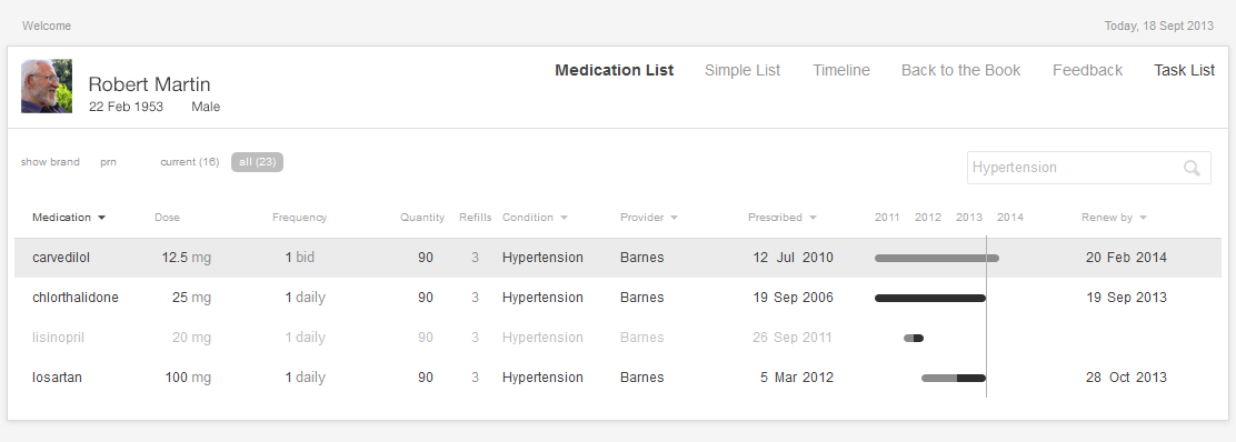 The interactive table allows users to sort, filter, and otherwise adjust their displays to meet the needs of the tasks at hand. This table is the standard workhorse of an EHR, and may sometimes be the only view available. The table is sufficiently flexible and powerful to adapt to fit a variety of tasks, but it can also be complex and may require more effort to learn and use than a simple list. Interactive lists help with a variety of tasks, such as making treatment decisions or e-prescribing. The list might even be able to draw on other data stored in the EHR, such as diagnoses, lab values or vital signs. Of our three examples, this list displays the most information and can provide the best support for cognitively intense tasks.